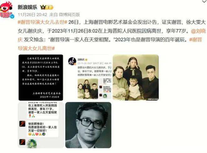 弟弟去世之后,后只剩下女儿谢庆庆孤身一人,23年11月,谢庆庆也走完了她76年的人生旅程,至此谢晋一家六口全部离世,